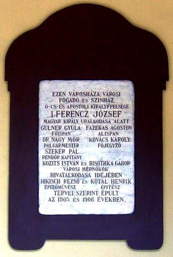 | Keywords: City-hall plaque in Kiskunhalas.jpg en Commemorative plaque to the costruction of the large ensemble of town hall hostel and theater in Kiskunhalas in 1906 It is placed near entrance of the town hall Kiskunhalas HÅ‘sök Square Nr 1 derivative work fr Plaque commémorative à la construction du grand ensemble du hôtel de ville auberge et théâtre à Kiskunhalas en 1906 Elle est apposée près de l ™entrée du hôtel de ville 1 place HÅ‘sök Kiskunhalas oeuvre dérivée hu A kiskunhalasi városháza-fogadó-szÃnház épületegyüttes 1906-os épÃtésének emléktáblája a városháza bejáratánál Kiskunhalas HÅ‘sök tere 1 másodlagos munka 2005-01-13 16 48 20 Cropped from http //commons wikimedia org/wiki/File Kiskunhalas_városháza_emléktábla JPG Original uploader was Csanády 46 25 49 50 N 19 28 41 40 E DEFAULTSORT Town hall cc-zero Uploaded with UploadWizard Kiskunhalas Town Hall Plaques in Kiskunhalas |