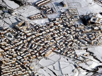 Keywords: city homes winter snow aerial view spain view outlook flight fly