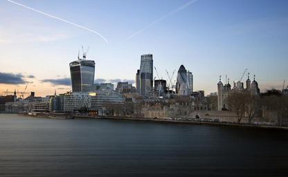 Keywords: city scene evening dusk twilight modern architecture skyscrapers skyline construction cranes buildings river downtown urban cityscape business
