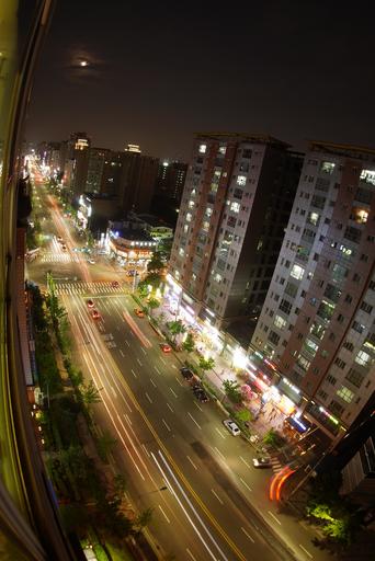 Keywords: city street fish eye night buildings road moon
