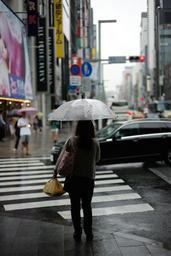 Keywords: city street intersection raining umbrella metropolis urban people walking district busy pedestrian