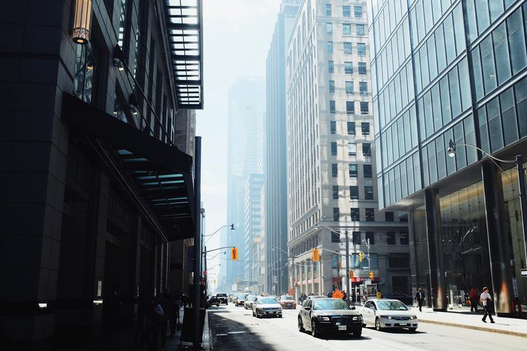 Keywords: city street skyscrapers architecture downtown street buildings cityscape traffic travel