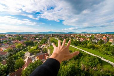 Keywords: city urban landscape explore discover hand rise people house roof high mountain clouds sky rock green urban city cityscape travel building architecture street town