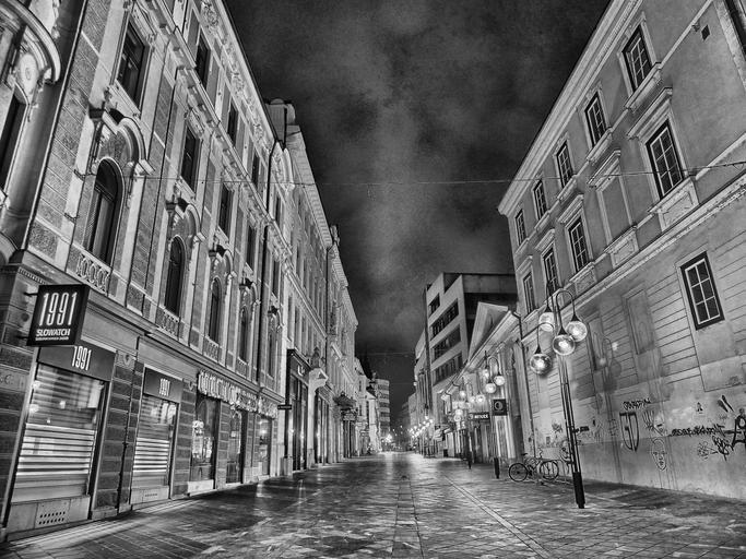 Keywords: city urban night evening black and white hdr sky clouds street lights lighting sidewalk buildings architecture outside beautiful