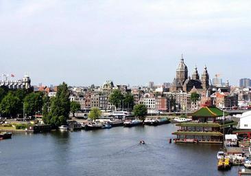 Keywords: amsterdam city buildings skyline architecture bay harbor water boats ships reflections trees outside summer spring urban