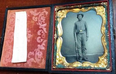 | Keywords: henry newton ornbaun henrynewtonornbaun civil war soldier cased civilwarsoldiercased photograph tintype military indiana 79th photographtintypemilitaryindiana79th indiana infantry vintage usa america kia chattanooga infantryvintageusaamericakiachattanooga campaign picture frame photo border drawing indoor Information given by ebay seller: "This young Civil War Soldier 1/6th plate tintype is identified as Great Uncle Newton Ornbaun. We tried to research him, at first with no luck. Fortunately research on Ancestry.com not only confirmed his identity, we were also able to find a photograph of his brother (Andrew Marion Ornbaun) that is identical to the one we are listing in a separate auction. His real name is Henry Newton Ornbaun, not Henry Osborn. When I read the letter from an officer documenting his wounds and bravery, the officer had spelled it wrong. Also when I looked at the draft papers, the name Osborn is intermingled with Ornbaun and Ornbaum. Henry Newton Ornbaun was with the 79th Indiana Infantry. He was injured in November 1863 during the Chattanooga Campaign, and died from his wounds on Dec 1st,1863. We are adding an excerpt from the letter from headquarters, documenting his injury. HDQRS. SEVENTY-NINTH REGT. INDIANA VOLS., Chattanooga, Tennessee, November 27, 1863. CAPT.: I have the honor to submit the following report of the part taken by the Seventy-ninth Regt. Indiana Volunteers and Eighty-sixth Regt. Indiana Volunteers, consolidated, and placed under my command by order of Gen. Beatty, in the battle before Chattanooga: On the 23d instant, at noon, orders were received to march, and leaving our camps we formed at supporting distance, in double column, in rear of the left of Brig.-Gen. Willich's command. The advance being made, we followed in the above order for about a mile, halted, deployed the column, and were ordered to form on the left of Gen. Willich's line. Not a shot was fired by my command during all this time. At night orders were received to fortify our position with rifle-pits and abatis. During the night we succeeded in accomplishing and carrying out the order as directed, and had at the break of day a line of field-works of much strength. Nothing occurred Tuesday, the 24th, or Wednesday, the 25th, until about 3 o'clock in the afternoon, at which time I was ordered by Gen. Beatty to advance with my command beyond our works and form on the left of the front line of Gen. Willich, to advance and take the rifle-pits of the rebels in our front. The rebels upon our approach abandoned their rifle-pits, which were occupied by our forces. Not having received any order to remain in the rebel works, I ordered my command to advance upon the mountain side in our front. Crossing the open space beyond the works we met a terrible fire, enfilading my command in all directions. The fire of the rebels becoming very severe, and their infantry in front, who were retreating before us, halting occasionally and firing upon us, I perceived that the safety of my command required it to get the protection of the mountain side to be enabled to take shelter among the trees and rocks. I urged a rapid advance, and with the hearty co-operation of the officers of both regiments the whole line was carried forward in the best order possible, on almost inaccessible ground. Here, protected by the steepness of the mountain, the men were enabled to make good their foothold, and reply to the rebel musketry, which was very galling and almost surrounding us. We advanced steadily step by step. When near the top my attention was called by Capt. Howe to the fact that our advance upon the mountain isolated us from the rest of the line with which we advanced upon the enemy's rifle-pits; there was no support on the right or left, and on looking back perceived our forces occupying the rebel works below; to retrace our steps would have been inevitable destruction to the entire command. The resolve to advance and hold every inch of ground until supported was our only safety. The line advanced firmly, taking advantage of every obstacle, under a most furious fire of artillery and small-arms, the enemy rolling lighted shells among my men and throwing rocks upon our heads: but the ground was held and contested with the utmost determination. The rebels did not succeed in forcing us back one step. We remained in our position, our flags and the enemy's almost touching, keeping up a heavy fire, until support came on the right and left, advancing up the mountain. At last orders were given to fix bayonets, and to charge them; once the effort failed, but advancing again, succeeded, and gained the enemy's works, which were covered with dead and wounded, and full of rebels, who made haste to fling away their guns and to get to our rear. As my men swarmed upon the crest the rebels made another stand, commanded, as ascertained, by the rebel Gen. Hardee, but their resistance was very feeble; they were quickly broken, and fled in the greatest confusion. Here a battle-flag was captured; I regret to say it was torn to shreds by the men in their eagerness to secure mementoes. After pursuing the rebels, and the capture of many pieces of artillery and numerous prisoners, the command bivouacked upon the crest of Missionary Ridge. It is with much pleasure that I can report the loss of both regiments as surprisingly little, when taken into consideration with the magnitude of the effort, and its results. A list of casualties is hereto appended.* I beg leave to call the attention of the general to the following officers whose conduct deserves special mention: Capt.'s Hanna, Jordan, and Howe, Adjutant Ritter, Lieut.'s Mounts and Burns, of the Seventy-ninth Indiana Volunteers; Capt.'s Sims, Gregory, and Carnahan, Lieut.'s McInerny and Laymon, of the Eighty-sixth Indiana Volunteers. They with all other officers did their whole duty. Among the enlisted men, where all displayed such daring, it is hard to make a distinction. First Se