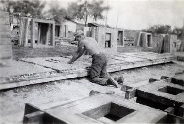 | Keywords: blackandwhite monochrome black and white 2012-0347m on back rubber-stamped "Mervin J. Hostetler, 879 Greenway Dr., Altoona, Pa. 16601" and handwritten "M. J. H. troweling newly poured concrete slabs used for privy floors." 2012-0347m on back rubber-stamped "Mervin J. Hostetler, 879 Greenway Dr., Altoona, Pa. 16601" and handwritten "M. J. H. troweling newly poured concrete slabs used for privy floors." | ||||
