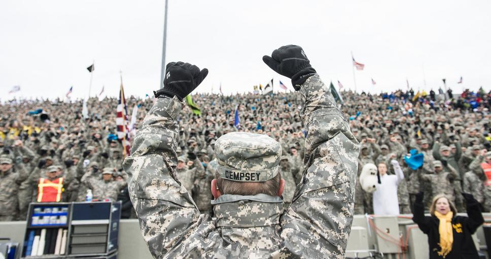 Keywords: CJCS attends Army vs. Air Force football game 141101-D-KC128-247.jpg en Chairman of the Joint Chiefs of Staff Gen Martin E Dempsey leads U S Military Academy Cadets in the rocket cheer during an Army vs Air Force football game at Michie Stadium West Point N Y Nov 1 2014 Air Force beat Army 23-6 winning the Commander-in-Chief's Trophy for the 19th time DOD photo by Mass Communication Specialist 1st Class Daniel Hinton/Released 2014-11-01 Petty Officer 1st Class Daniel Hinton https //www dvidshub net/image/1734276 141101-D-KC128-247 2015-01-24 10 05 WEST POINT NY US PD-USGov Martin E Dempsey Images from DoD uploaded by Fæ