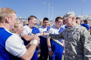 | Keywords: CJCS and VCJCS attend Warrior Games Tailgate and AF vs. Navy football 141004-D-HU462-232.jpg en Chairman of the Joint Chiefs of Staff U S Army Gen Martin E Dempsey fist bumps Air Force Academy cheerleaders during the Air Force vs Navy football game at the U S Air Force Academy's Falcon Stadium in Colorado Springs Colo Oct 4 2014 DOD photo by Staff Sgt Sean K Harp U S Army/Released 2014-10-04 Staff Sgt Sean Harp https //www dvidshub net/image/1603434 141004-D-HU462-232 2014-10-07 16 02 UNITED STATES AIR FORCE ACADEMY CO US PD-USGov Martin E Dempsey Falcon Stadium Images from DoD uploaded by Fæ |