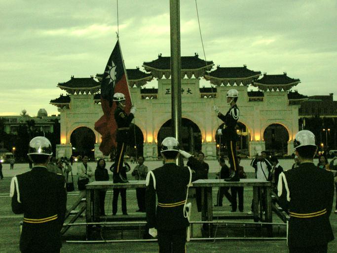 | Keywords: CKS Memorial Hall flag guards.jpg  en ROC Army honor guard lowering the flag at CKS Memorial Hall in the evening zh-tw 中正 念堂廣場舉行降旗典禮的中華民 陸軍 隊  2005-12-20 Own L Chang The Honor Guard of Republic of China Army Salutes to flags Military people with flags of the Republic of China Gate of Great Centrality and Perfect Uprightness Taipei |