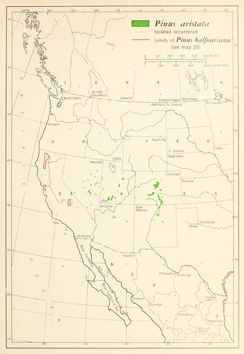 | Keywords: CL-21 Pinus aristata range map.png en Map 21 Pinus aristata distribution 1966 http //www biodiversitylibrary org/bibliography/66393 /summary Geographic distribution of the pines of the world Miscellaneous publication no 991 U S Department of Agriculture Forest Service Washington D C February 1966 William B Critchfield Elbert L Little Jr U S Department of Agriculture Forest Service PD-USGov Geographic Distribution of the Pines of the World Uploaded with UploadWizard Pinus aristata range maps |