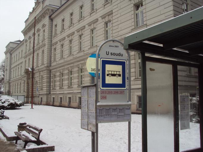 Keywords: ČL U soudu.JPG cs Autobusová zastávka na Děčínské ulici v České Lípě za ní budova soudu own Zákupák 2013-02-13 Děčínská Česká Lípa Bus stops in Česká Lípa District Court in Česká Lípa Bus stop signs in the Czech Republic