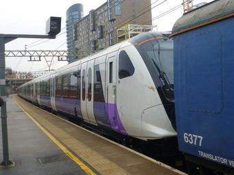 | Keywords: stratford station train railway class 345 class345 translator coach translatorcoach translator carriage translatorcarriage crossrail elizabeth line elizabethline vehicle outdoor The first Class 345 Crossrail Line 1 (Elizabeth) train plus one of the translator carriages pass by platform 10a at Stratford station London whilst on their way to Ilford depot. The first Class 345 Crossrail Line 1 (Elizabeth) train plus one of the translator carriages pass by platform 10a at Stratford station London whilst on their way to Ilford depot. The first Class 345 Crossrail Line 1 (Elizabeth) train plus one of the translator carriages pass by platform 10a at Stratford station London whilst on their way to Ilford depot. stratford station train railway class345 translatorcoach translatorcarriage crossrail elizabethline Class345-Crossrail-Line1-FirstTrain-P1390639.jpg en The first Class 345 Crossrail Line 1 Elizabeth train and part of a translator carriage pass by platform 10a at Stratford station London Hauled by diesel locomotive 67 013 and with translator carriages at each end this journey was taking the brand new train to Ilford depot 2016-12-09 11 45 12 own Spsmiler other versions cc-zero Electric multiple units at Stratford station |