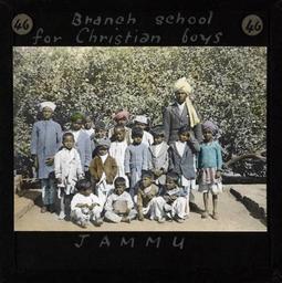 | Keywords: Class of Christian School Boys, Jammu, ca.1875-ca.1940 (imp-cswc-GB-237-CSWC47-LS10-046).jpg en <br> Class of Christian School Boys Jammu ca 1875-ca 1940 Branch school for Christian boys Photograph of a class of young Christian school boys A teacher is standing to the right of the group and there is an older boy to the left ; This belongs to a series of Church of Scotland Foreign Missions Committee lantern slides relating to Jammu City which is also known as the City of Temples A mission station occupied by Church of Scotland missionaries was founded here in the late 19th/early 20th century Jammu is also one of the three administrative divisions within Jammu and Kashmir the northernmost state in India Photographer Unknown Filename imp-cswc-GB-237-CSWC47-LS10-046 tif Coverage date 1875/1940 Part of collection International Mission Photography Archive ca 1860-ca 1960 Geographic subject region Jammu and Kashmir Type images Part of subcollection Photographs from the Centre for the Study of World Christianity University of Edinburgh U K ca 1900-ca 1940s Repository name Centre for the Study of World Christianity Archival file impaunpub_Volume7/1763 url Repository address The University of Edinburgh School of Divinity New College Mound Place Edinburgh EH1 2LX United Kingdom Geographic subject country India Format aacr2 1 lantern slide 8 x 8 cm Geographic subject continent Asia Rights Contact the repository for details Part of series In the Temple City of Jammu LS10 Repository email divinity-CSWC ed ac uk Subject lcsh Keyword Religious education; Children Date created 1875/1940 Publisher of the digital version University of Southern California Libraries Subject aat genre group portraits Format aat lantern slides Legacy record ID impa-m69314 Access conditions http //www ed ac uk/schools-departments/divinity/research/centres/world-christianity/collections-resources File GB 237 CSWC47/LS10/46 1875/1940 author http //digitallibrary usc edu/cdm/ref/collection/p15799coll123/id/64880 PD-old-70-1923 Magic lantern images Images from USC Digital Library uploaded by Fæ International Mission Photography Archive ca 1860-ca 1960 |