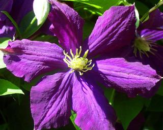 Keywords: clematis flower violet purple petals bloom close up macro still life bright colorful sunny day sunlight green leaves leafy background fleurs blossom blooming flowering plants ornamental decorative vines climbers