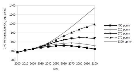 | Keywords: Climate change mitigation scenarios (IIASA). Atmospheric greenhouse gas concentrations 2000-2100.png greenhouse gas GHG concentrations between the years 2000 and 2100 for a range of climate change mitigation scenarios GHG concentrations are measured in carbon dioxide-equivalents GtCO<sub>2</sub>-eq in units of parts-per-million by volume ppmv Concentrations include the full basket of GHGs as well as other radiatively active gases such as aerosol and aerosol precursors Projections for 5 scenarios are shown Each scenario is designed to stabilize atmospheric GHG concentrations at a different level 450 520 670 970 and 1390 ppmv A summary table of the graph data is given in a later section References Scenario data can be freely downloaded from International Institute for Applied System Analysis IIASA http //www iiasa ac at/web-apps/ggi/GgiDb/dsd Action htmlpage page about GGI Scenario Database Ver 2 0 2009 Archived https //web archive org/web/20131004192147/http //www iiasa ac at/web-apps/ggi/GgiDb/dsd Action htmlpage page about 4 October 2013 These are the A2r mitigation scenarios 2014-10-29 08 35 48 own Enescot other versions Data Atmospheric GHG concentrations for scenarios 2000 to 2100 wikitable sortable - Scenario Year<br/>2000 2030 2050 2100 - 450 ppmv 369 2 475 5 512 6 441 7 - 520 ppmv 369 2 484 0 548 3 515 1 - 670 ppmv 369 2 492 8 600 1 675 1 - 970 ppmv 369 2 498 7 650 3 985 0 - 1390 ppmv 369 2 502 9 682 9 1349 7 cc-zero Uploaded with UploadWizard Greenhouse gases |
