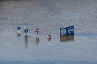 Keywords: climate danger disaster environment flood flooding high nature over rain river road sign roadsign street traffic underwater water weather wet