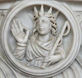 | Keywords: Clipeus Helios Terme.jpg Bust of Helios in a clipeus detail from a strigillated lenos sarcophagus White marble early 3rd century CE From Tomb D in Via Belluzzo Rome Buste d'Hélios dans un clipeus détail d'un sarcophage à lenos Marbre blanc début du IIIe siècle ap J -C Provenance tombe D Via Belluzzo Rome Busto di Helios entro clipeo dettaglio di un sarcofago strigilato a lenos Marmo bianco inizi del III sec d C Rinvenuto a Roma via Belluzzo tomba D Museum Terme di Diocleziano Cloister object history credit line accession number Jastrow 2006 other versions Helios Ancient Roman reliefs in Rome Museo delle Terme Ancient Roman reliefs in the Museo delle Terme di Diocleziano Rome Round reliefs in Rome Terme Whips in art Ancient Roman sarcophagi in Rome Terme 3rd-century sarcophagi Rome |