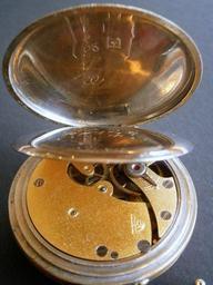 Keywords: clock movement pocket watch horology watchmaker antique nostalgia old ancient pops up lid interior view inside view transmission wheel dynamics dynamic gear into each other historically golden antiquarian close