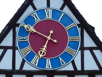 Keywords: clock time of clock face time indicating blue indigo colorful color cute truss fachwerkhaus stein am rhein