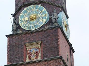 Keywords: clock tower town hall time clock tower time of pointer clock face gold golden sun wroclaw poland silesia marketplace historic town hall historic old town
