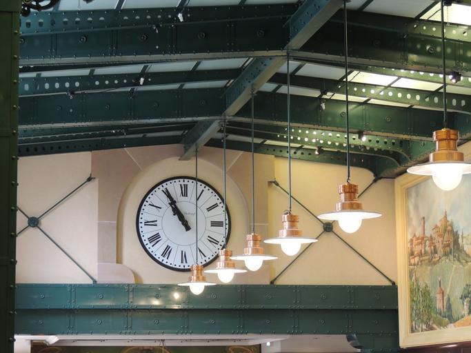 Keywords: clock train station time architecture travel station transportation building interior hall lamps steel metal structure historic