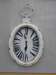 Keywords: clocks time vintage old devices black white oval shaped watch hanging stonewalls grey gray walls buildings cement concrete flat surfaces smooth timepiece