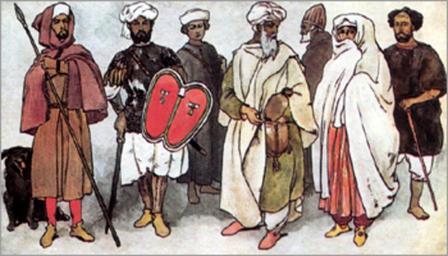| Keywords: Clothing of Spain Table72-3.jpg  Clothing of Spain spanish arabes Испанские мав ы 1 Охотник с копьем Суконная ве хняя одежда маленький во отник-капюшон Желтые кожаные башмаки пове х к асных штанов-чулок из мягкой ко довской кожи 2 Воин в кольчуге Панци ь легкий щит п ямой меч 3  ужчина в тю бане п остой фо мы 4 Го ожанин в кафтане с  укавами длинных штанах плаще с кожаным кошелем в мягких башмаках и тю бане 5  ужчина в конусооб азной вышитой шапке 6  ав итанка с еднего сословия в длинных ши оких штанах платье со складками белом пок ывале и на ядной обуви 7 П остолюдин в одежде с уко оченными  укавами и полудлинных ши оких штанах History of costume http //silveromsk virtbox ru/moda/index152-2 html century 19 anonimous PD-Art Clothing of Spain Files uploaded by Shakko from various sources Moorish clothing |