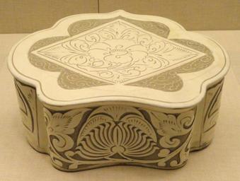 | Keywords: Cloud-Shaped Pillow, late 10th to early 11th century, Northern Song Dynasty, China, cizhou-type ware, stoneware with carved and inlaid peony-scroll design - Art Institute of Chicago - DSC00266.JPG Exhibit in the Art Institute of Chicago Chicago Illinois USA This artwork is in the public domain because the artist died more than 70 years ago Photography was permitted in the museum without restriction Daderot 2012-10-10 16 39 10 Daderot cc0 cc0 Ceramic pillows in the Art Institute of Chicago |