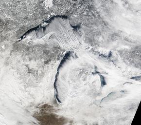 | Keywords: Cloud Streets over the Great Lakes, Natural Hazards DVIDS837588.jpg en Like strokes from an artist's brush the sky over Lake Superior and Lake Michigan was painted with long rows of white clouds on February 5 2007 Called cloud streets these clouds occur when frigid dry air blows across the lake where it picks up water vapor from the warmer lake The water vapor freezes into ice crystals and clouds form The clouds take the shape of the wind as it gusts over the water The same process can also cause lake effect snow or rain when the cold moist air blows ashore on the lee side of the lake Signs of lake effect snow can be seen along the southern shore of Lake Superior which is bright white with little sign of brown vegetation poking through 2011-08-01 https //www dvidshub net/image/837588 837588 2013-02-08 05 52 WASHINGTON D C US PD-USGov Lake Michigan Lake Superior Images from DoD uploaded by Fæ |