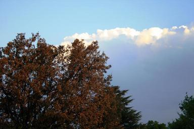 Keywords: clouds cumulus white large heavy shadowed catching sunlight tree leaves lit gold-rust sky