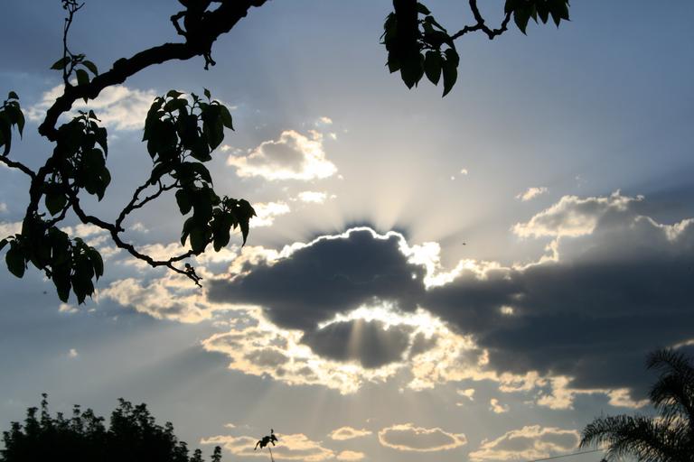 Keywords: clouds dark edging bright shiny light rays radiating sky blue branch