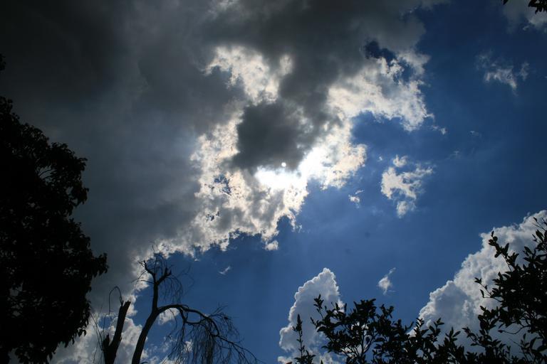 Keywords: clouds gathering closing in storm building dark light edges luminous blue sky trees