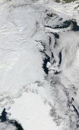 | Keywords: Clouds over Ice, Image of the Day DVIDS847615.jpg en In a photo-like satellite image the faintest of shadows or shading of grey may give them away but more often clouds over the poles simply disappear against the background camouflaged from the satellite's view by the underlying snow and sea ice For those trying to track clouds from space to understand cloud physics say or to predict the weather the problem is frustrating Only with a combination of visible and invisible wavelengths of light such as infrared light do clouds become distinct from the snow and ice below One of NASA's sensors that has the capability of detecting many visible and infrared wavelengths of light is the Moderate Resolution Imaging Spectroradiometer modis gsfc nasa gov MODIS a version of which flies on both the terra nasa gov/ Terra and aqua nasa gov/ Aqua satellites Because MODIS sees in both infrared and visible light it can provide a picture of cloud cover in the Arctic as shown in this pair of images The top image shows the Arctic Ocean in visible light as it would look to a human flying over in an airplane or in a digital photograph The lower image shows the same view in a combination of visible and infrared light In this light clouds take on a slight orange tint while the underlying sea ice and the land-based glacial ice over Kvitoya Island become bright purple Ocean water goes from nearly black in visible light to bright blue in infrared In the visible image only the high clouds that cast their shadow on the cloud and ice below them are visible but the infrared image reveals a large bank of clouds over the ice Finding such elusive Arctic clouds is a key element in understanding how global warming might impact the region For Seiji Kato an atmospheric scientist affiliated with NASA's Langley Research Center through Hampton University such MODIS images helped him determine that the Arctic got cloudier between 2000 and 2004 Kato discovered the increase in clouds while trying to detect changes in the amount of incoming sunlight the Earth's polar regions reflect In the Arctic ice and snow reflect light back into space which prevents the surface from soaking up sunlight and warming up Dark water by contrast absorbs sunlight and heats up If warming temperatures such as those caused by global warming melt the ice then the water will absorb incoming sunlight and heat up which amplifies the initial warming At the same time more open water means that more water vapor can build in the atmosphere and more clouds can form Like ice clouds reflect light back into space which could dampen warming by shielding the surface from light Since Arctic sea ice had been declining rapidly in recent years Kato wondered if the poles had become less reflective as a result To answer the question Kato and several teammates compared a suite of NASA and NOAA National Oceanic and Atmospheric Administration satellite observations of reflected sunlight clouds and sea ice and snow cover at polar latitudes from 2000-2004 No trends were detected in the Antarctic but in the Arctic sea ice had definitely declined Interestingly the amount of light reflected had not changed The reason An increase in clouds compensated for the loss in snow and sea ice To read more about the team's investigation read the Earth Observatory feature story earthobservatory nasa gov/Study/ArcticReflector/ Arctic Reflection Clouds Replace Snow and Ice as Solar Reflector NASA Identifier ge_07378 2011-07-08 Glenn Research Center https //www dvidshub net/image/847615 847615 2013-02-08 12 29 WASHINGTON D C US PD-USGov Langley Research Center Images from DoD uploaded by Fæ |