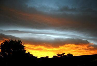 Keywords: clouds shelf streaked white marble sunset orange yellow bright glow striking stunning trees silhouettes sky