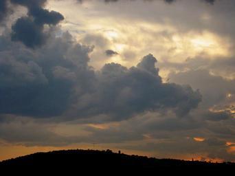 Keywords: clouds sky sunset orange yellow gold glow light luminous sweeping tumultuous dark hill