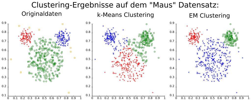 | Keywords: ClusterAnalysis Mouse de.svg Cluster analysis performed on an artificial dataset Mouse similar to a well-known comic figure comparing k means and EM clustering results The tendency of k-Means to produce clusters of the same extends produces bad results while the Gaussian nature of the data is well recognized by EM The visualization was generated using ELKI Clusteranalyse auf einem künstlichen Datensatz Maus ähnlich einer bekannten Comic-Figur mit den Algorithmen k-Means und EM Die Tendenz von k-Means cluster gleicher räumlicher Ausdehnung zu produzieren führt zu einem schlechten Ergebnis Der aus Normalverteilungen bestehende Datensatz ist dagegen ideal für EM das die Daten mit Normalverteilungen zu modellieren versucht Visualisiert mit ELKI 2010-10-12 own Chire Other versions ClusterAnalysis Mouse svg Other fields ELKI + Cc-zero Cluster analysis Algorithms |
