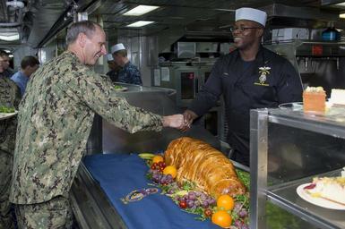 | Keywords: CNO visits sailors 131128-N-WL435-555.jpg en Chief of Naval Operations Adm Jonathan Greenert has lunch with sailors aboard the guided-missile cruiser USS Gettysburg CG 64 after an all-hands call with Master Chief Petty Officer of the Navy Mike Stevens on Thanksgiving Day Greenert and Stevens wanted to spend time with members of their Navy-Marine Corps family during the Thanksgiving holiday period to show their support and appreciation for the many men and women who serve in the military U S Navy photo by Chief Mass Communication Specialist Peter D Lawlor/Released 2013-11-28 Petty Officer 1st Class Peter Lawlor https //www dvidshub net/image/1064375 131128-N-WL435-555 2013-12-02 23 17 GULF OF OMAN AT SEA PD-USGov-Military-Navy Jonathan W Greenert in 2013 USS Gettysburg CG-64 Images from DoD uploaded by Fæ |