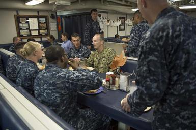 | Keywords: CNO visits sailors 131128-N-WL435-563.jpg en Chief of Naval Operations Adm Jonathan Greenert has lunch with sailors aboard the guided-missile cruiser USS Gettysburg CG 64 after an all-hands call with Master Chief Petty Officer of the Navy Mike Stevens on Thanksgiving Day Greenert and Stevens wanted to spend time with members of their Navy-Marine Corps family during the Thanksgiving holiday period to show their support and appreciation for the many men and women who serve in the military U S Navy photo by Chief Mass Communication Specialist Peter D Lawlor/Released 2013-11-28 Petty Officer 1st Class Peter Lawlor https //www dvidshub net/image/1064377 131128-N-WL435-563 2013-12-02 23 17 GULF OF OMAN AT SEA PD-USGov-Military-Navy Jonathan W Greenert in 2013 USS Gettysburg CG-64 Images from DoD uploaded by Fæ |
