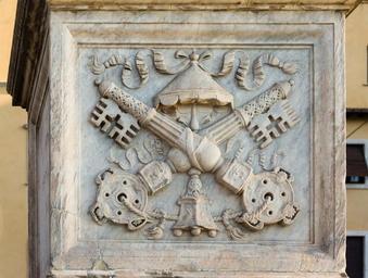 | Keywords: CoA relief Sede Vacante, Sant'Angelo bridge, Rome, Italy.jpg umbraculum and keys of Saint Peter symbols of the Catholic Roman Church and the College of Cardinals Sant'Angelo bridge Rome Italy 2013-08-23 for photograph own Jebulon 41 901425 12 466516 cc-zero Uploaded with UploadWizard Reliefs of coats of arms in Rome Coats of arms on bridges Ponte Sant'Angelo Rome Umbraculum in heraldry Valued images by Jebulon Quality images by Jebulon Emblems of Sede vacante QualityImage | ||||
