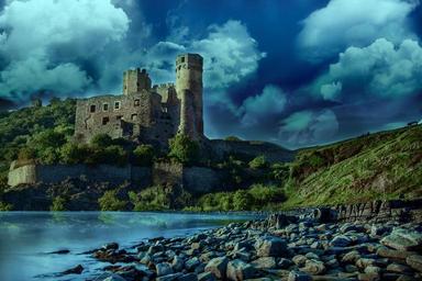Keywords: coast beach rock stones sky clouds lake water germany rhine castle shipping cloudy skies blue sunset reflection