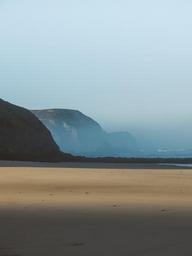 Keywords: coast shore beach cliffs steep vertical mist fog view sand water breakwater waves sea ocean