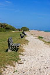 Keywords: coastal path path stones stoney seats bench benches row wooden wooden benches summer seaside coast blue sky photo image outdoors nobody grass green track