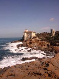 Keywords: coastline seashore castle cliff tuscan coast rocky seaside mansion sturdy stone structure crashing waves sea