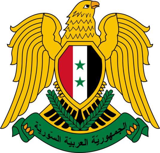 | Keywords: Coat of arms of Syria.svg Coat of arms of Syria -- the Hawk of Qureish with shield of vertical tricolor of the national flag holding a scroll with the words الجمهورية العربية السورية Al-Jumhuriyah al-`Arabiyah as-Suriyah The Syrian Arab Republic Ð“ÐµÑ Ð± Ð¡Ð¸Ñ Ñ–Ñ— national symbol adopted in 1972 for the 1972-1977 Federation of Arabic Republics including Egypt Syria and Libya but subsequently modified to have specifically Syrian symbolism and with the color of the scroll changed to green 05-03-2007 Tonyjeff based on national symbol with the help of AnonMoos insignia original upload log wikitable date/time username resolution size edit summary ---- 17 40 5 March 2007 User Tonyjeff 461×461 57 KB <nowiki> Coat of arms of Syria -- the Hawk of Qureish with shield of vertical tricolor of the national flag holding a scroll with the words الجمهورية العربية السورية Al-Jumhuriyah al-Arabiyahas-Suriyah - Syri</nowiki> Coats of arms of Syria Hawk of Quraish Hawks and Falcons in supporters |