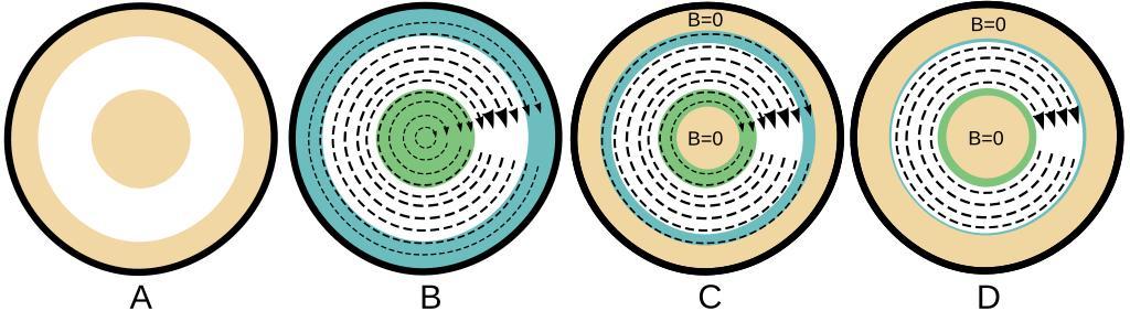 Keywords: Coax and Skin Depth.svg en Four stages of skin effect in a coax showing the effect of inductance Color code black overall insulating sheath tan conductor white dielectric green current into the screen blue current coming out of the screen dashed blue lines with arrowheads magnetic flux B The width of the dashed blue lines is intended to show relative strength of the line integral of the B field The four stages A B C and D are unenergized low frequency middle frequency and high frequency respectively There are three regions that may contain B flux the center conductor the dielectric and the outer conductor In stage B current covers the conductors uniformly and there is B flux in all three regions In stage C the flux in the dielectric is unchanged from stage B but some of the cross sections of the center conductor and outer conductor have no current and no flux There is less energy stored in the field for the same current so the inductance is less In stage D the skin effect is fully developed The current is confined to the surface of the conductors The flux in the dielectric is unchanged from stage B but there is no current and no flux in the conductors There is less energy stored for the same current relative to stage C so the inductance less than the inductance of stage C Coax_and_Skin_depth png 2011-03-02 07 58 UTC Coax_and_Skin_depth png Constant314 derivative work Gregors <span class signature-talk >talk</span> Redraw of pixel png image as vector svg Gregors Coax_and_Skin_depth png Cc-zero Original upload log This image is a derivative work of the following images File Coax_and_Skin_depth png licensed with Cc-zero 2011-02-17T17 17 47Z Constant314 3526x1101 397048 Bytes <nowiki> </nowiki> 2011-02-17T13 16 06Z Constant314 3526x1101 397048 Bytes <nowiki> en Four stages of skin effect in a coax showing the effect of inductance own Constant314 2-17-2011 Permission</nowiki> Uploaded with derivativeFX Electromagnetics Transmission lines Skin effect
