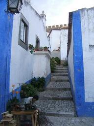 Keywords: cobblestone street portugal stairs walls old town blue white architecture