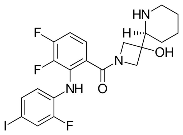 | Keywords: Cobimetinib.svg Chemical structure of cobimetinib Own 13 53 18 November 2013 UTC Ed Edgar181 valid svg Azetidines Benzamides Difluorobenzenes Fluoroanilines Fluoroiodobenzenes N N-disubstituted primary amides Piperidines Tertiary alcohols Tyrosine-kinase inhibitors Secondary amines |