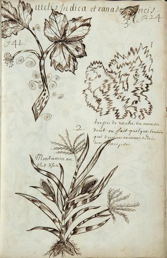 | Keywords: Codex canadensis, p. 24.jpg fr Codex canadensis p 24<br> 1 tripe de roche ou mousse / dont on fait quelque boulion / qui devient comme de la cole / tres Incipide<br>2 Mentamin ou / bled dInde <br>3 Victis indica et canadencis en 1 Tripe de roche or moss from which a bouillon is made which becomes like a very insipid glue <br>2 Mentamin or Indian corn <br>3 upper left Vitis indica et canadensis ca 1675-82 http //www collectionscanada gc ca/codex/026014-1100-f html Louis Nicolas 1634 - ca 1682 other versions PD-old-100 Codex canadensis Uploaded with UploadWizard |