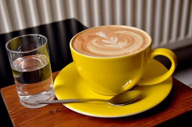 Keywords: coffee capuccino drink hot yellow cup glass water café rest arousal caffeine